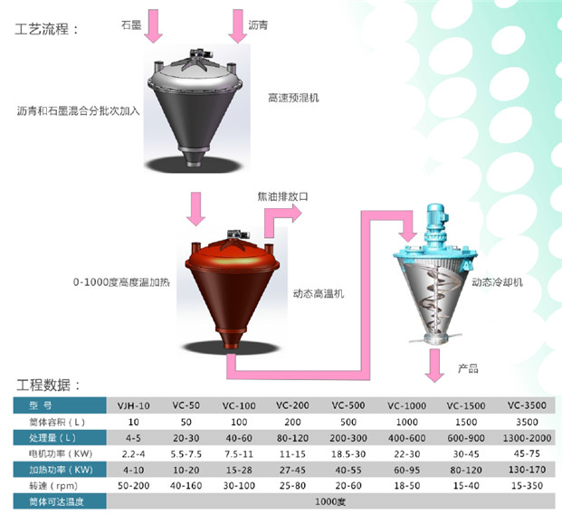 VJH高溫包覆改性機是我公司結合國外先進技術最新研發的混合設備,提高混合效率,使顆粒能充分的混合和分散,并能達到微米級混合均勻的混合機。它具有廣泛的用途,如料費、液體和粉料的強混合球型化、分散、破碎、干燥、造粒和包覆等功能。通過轉軸的速度產生離心力將產品推向混合腔體內壁。此時腔體的錐形形狀及刀片的形狀使產品產生一個沿內壁向 上的運動。產品再由特別設計的混合機蓋引導到混合機的中心,并回落到混合腔的底部,重新開始新一輪的混合過程。 桶壁隔套有加熱源,熱量通過簡壁傳遞到桶內,通過攪拌刀片的運行將熱量經由物料向簡體各個角落輸送,由于刀片的不同角度設計,使得物料在桶內均勻被加熱,包覆,改性。
